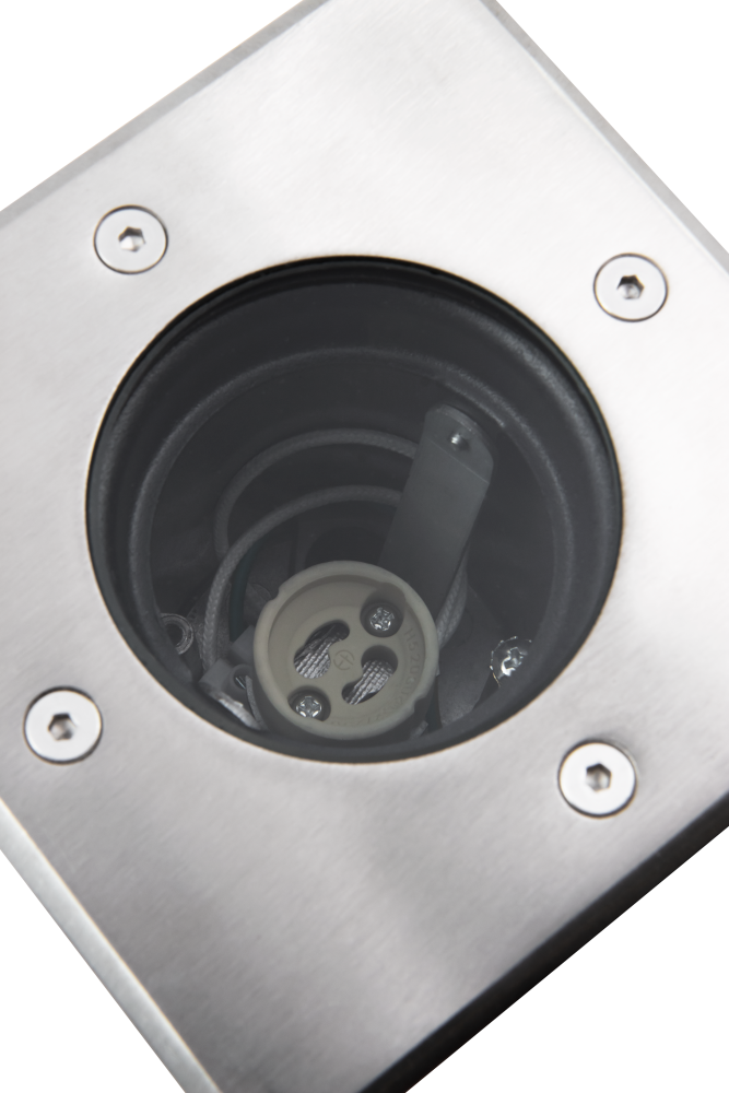 • Außen 120x120mm • Höhe 140mm • trittfestes und befahrbares Frontglas • mit je 1 Ein- und Ausgang zum einfachen durchverdrahten, so können mehrere Strahler in Reihe geschaltet werden • Aluminium-Gehäuse • IP67 • Leuchtmittel ist schwenkbar • für GU10 max. 35W (nicht enthalten) • LED geeignet • inkl ca. 20cm Anschlusskabel mit Lüsterklemme