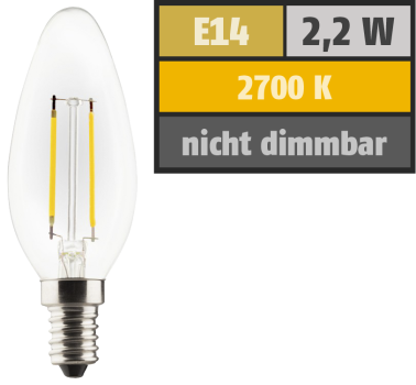 LED Filament Kerzenlampe, E14, 2,2W, 250lm, 2700K, warmweiß