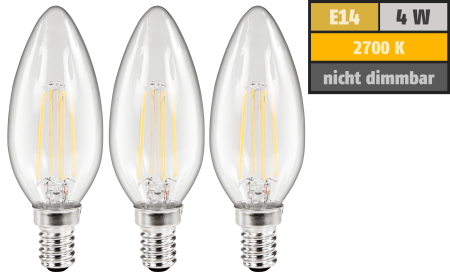 LED Filament Kerzenlampe, E14, 4W, 470lm, 2700K, warmweiß, 3er Set